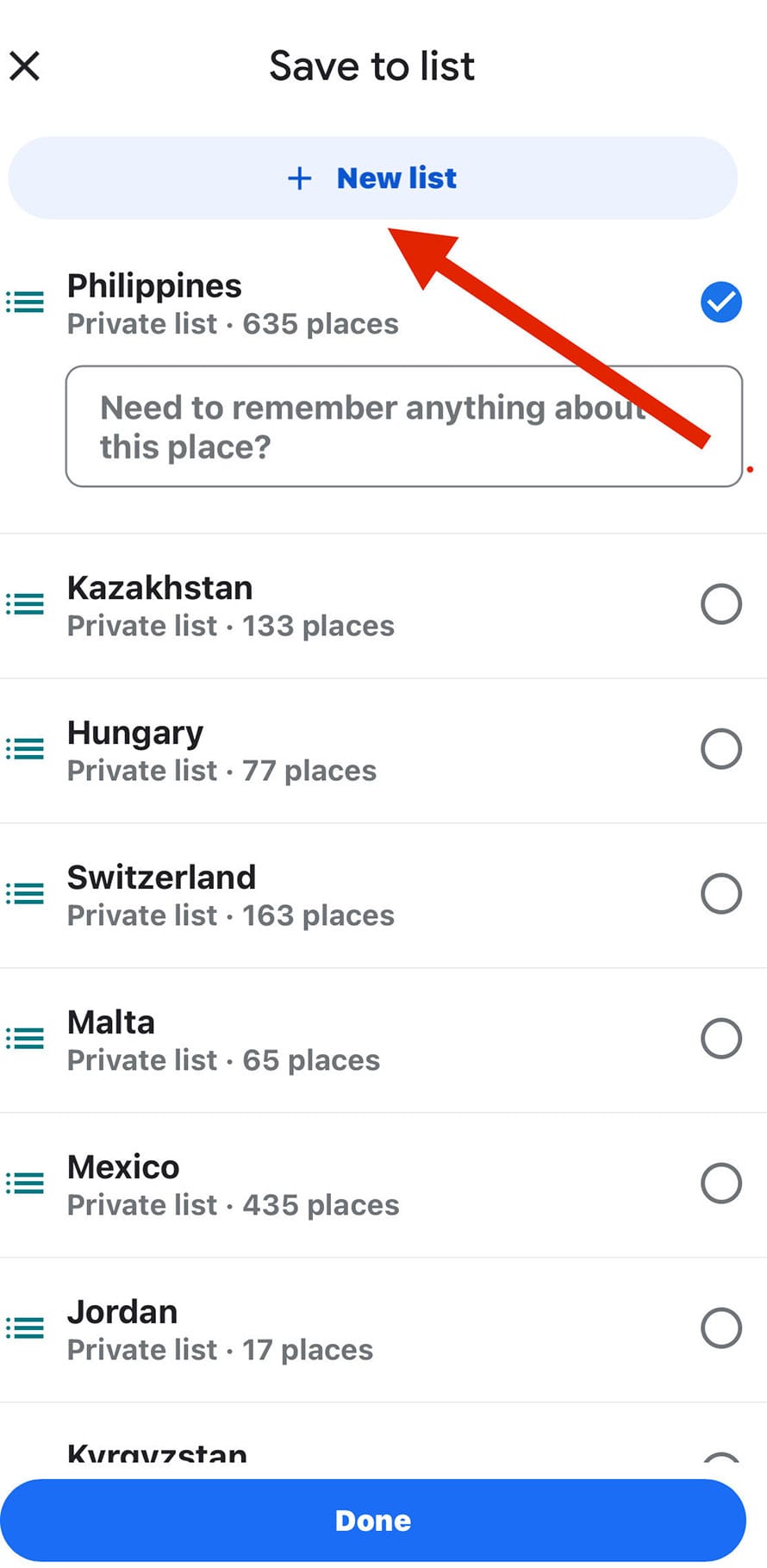 The list for each country just keeping all of the locations well organized so I can just open them when I just want to check about restaurants or attractions that I saved at home.